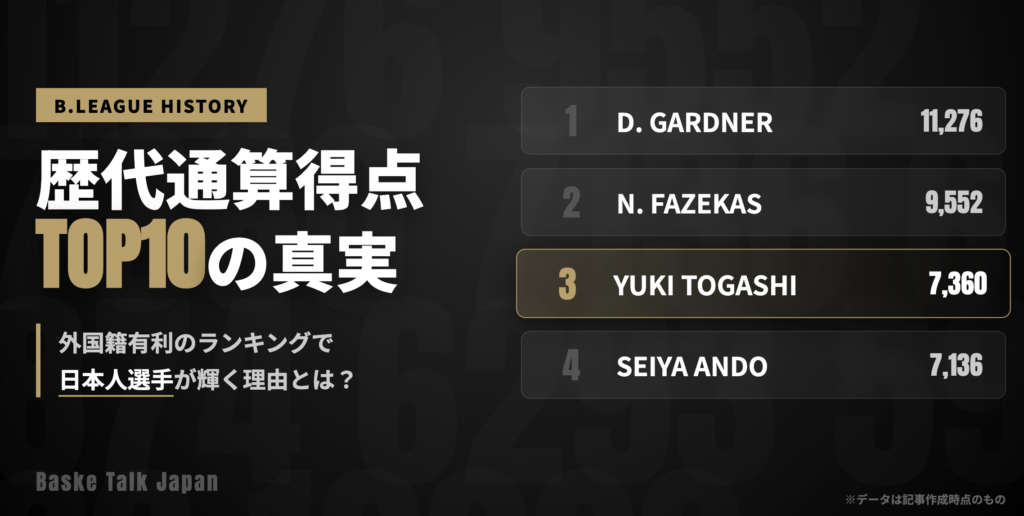 Bリーグの試合を見ていると、どうしても外国籍選手の圧倒的な得点力に目が向きがちです。しかし、リーグ開幕からの積み上げである「Bリーグ歴代得点ランキング(通算得点)」という視点でデータを見ると、意外な事実が浮かび上がってきます。 上位には確か...